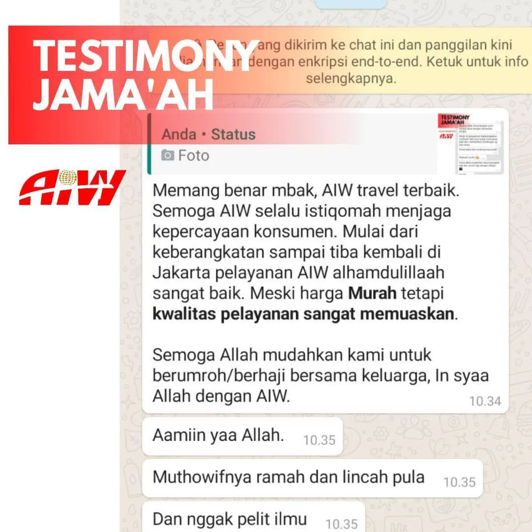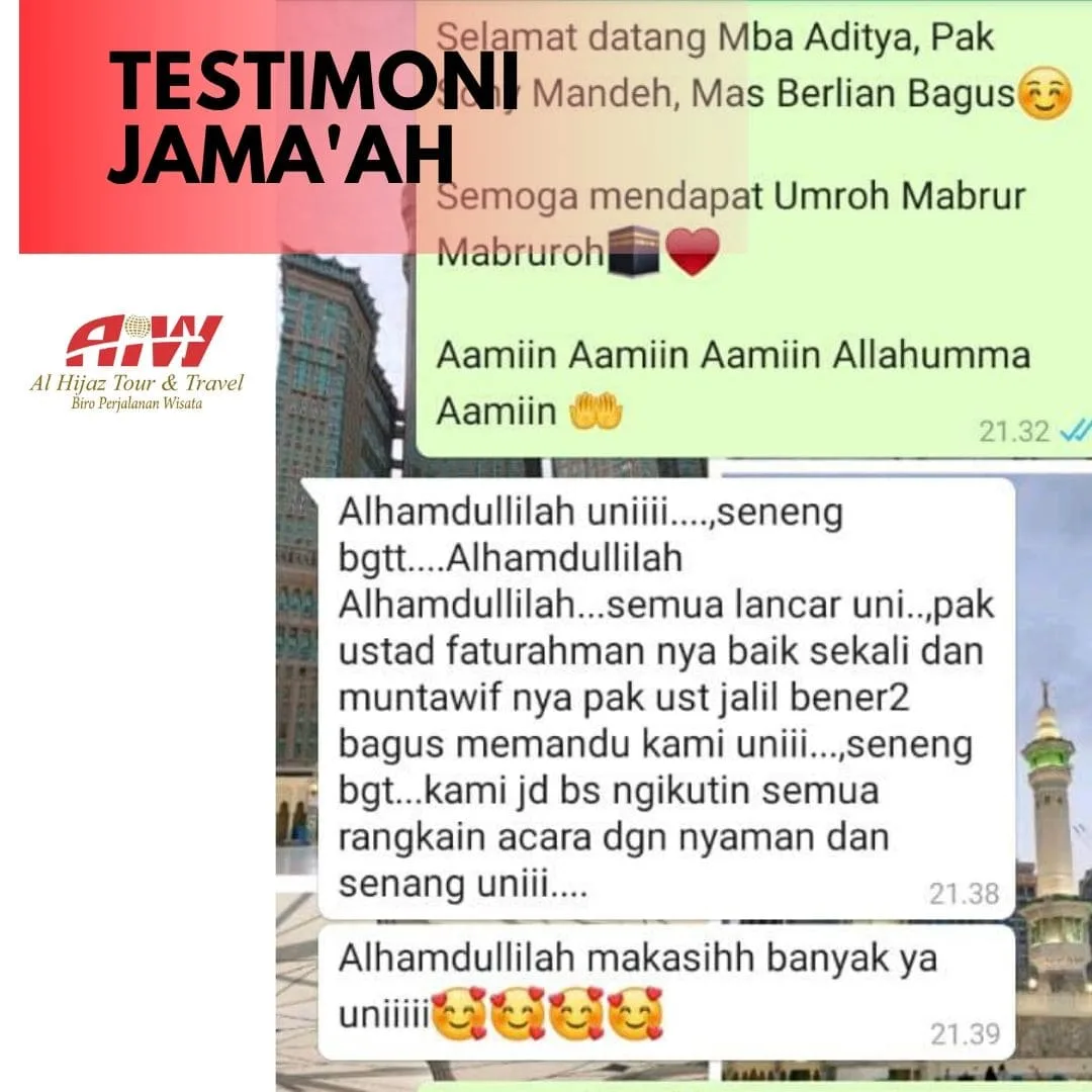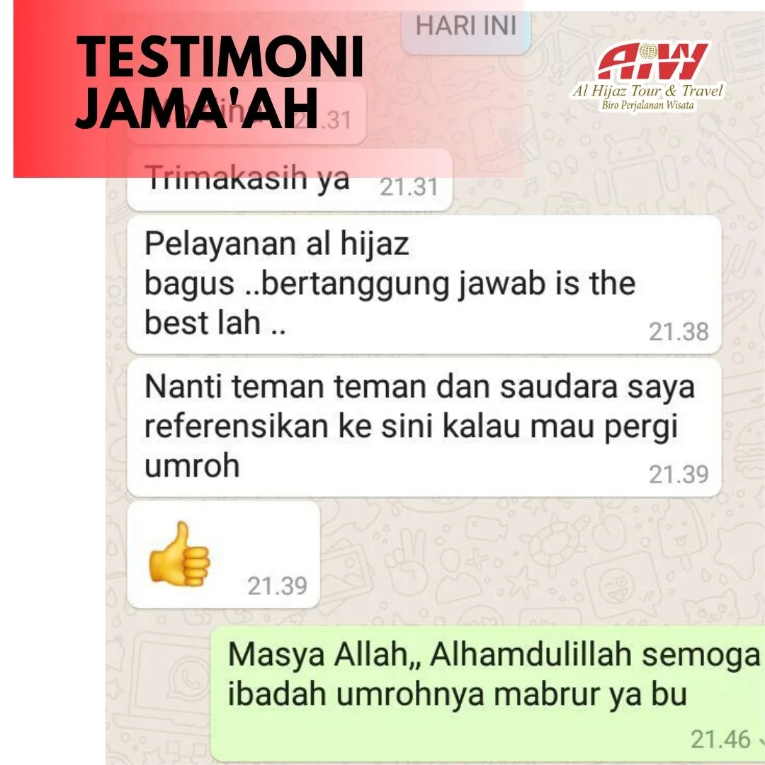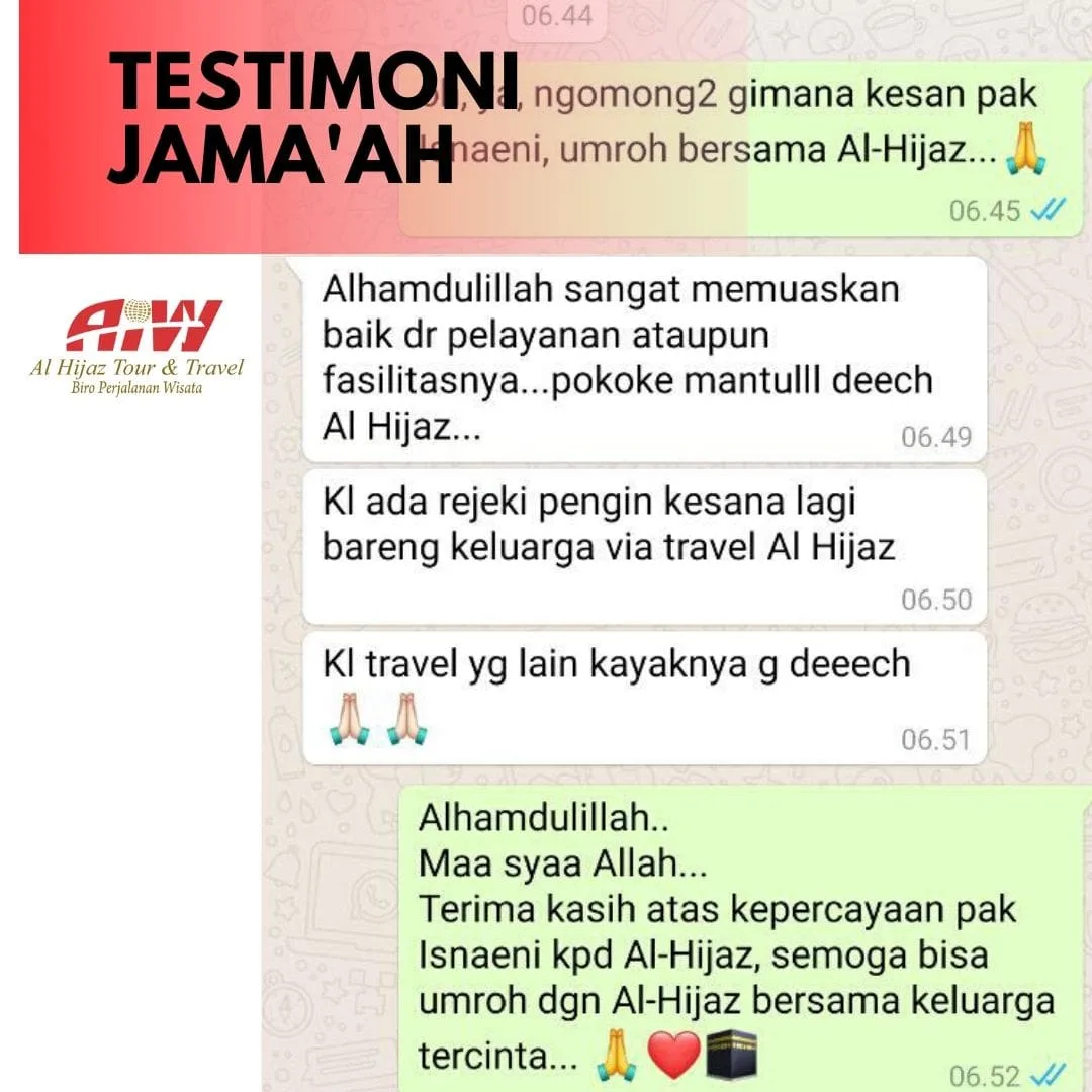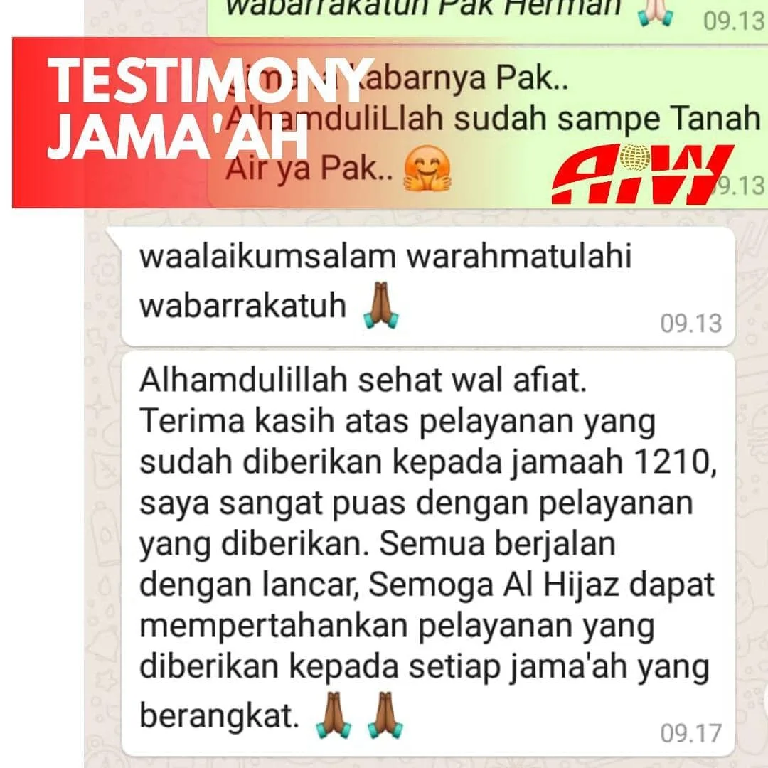 Merupakan suatu kehormatan bagi kami atas pilihan anda menggunakan jasa layanan PT Al Hijaz Indowisata dalam pelaksanaan ibadah haji atau umrah anda, dan kami berusaha untuk memberikan layanan yang terbaik kepada anda karena anda adalah tamu-tamu Allah. Harapan kami semoga perjalanan ibadah haji atau umrah anda bersama kami memiliki kelebihan tersendiri dalam pelayanan yang baik dan program yang teratur, Kami memohon kepada Allah Subhanahu Wa Ta’ala semoga Allah menerima segala amal shalih kita dan menjadikan ibadah umrah Anda maqbulah dan ibadah haji Anda mabrur.. Amin